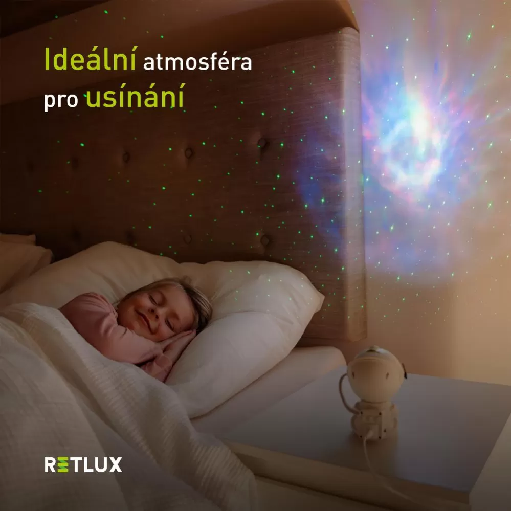 Kompaktní projektor RNL 109 ve tvaru malého astronauta přenese kouzlo hvězdné oblohy do každého dětského pokoje. Nabízí 8 dynamických režimů projekce s volbou mezi rotující mlhovinou, hvězdným polem nebo jejich kombinací. Ovládání je intuitivní pomocí tlačítek nebo přiloženého dálkového ovladače.